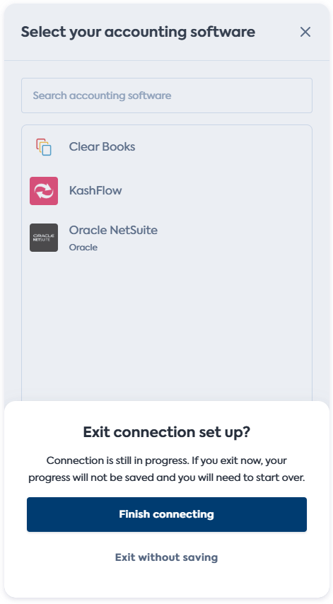 - Exit without saving stops the progress of the connectionConnection A link between a Codat company and a data source (like an accounting platform). Each connection represents authorized access to pull or push data from that platform. flow.